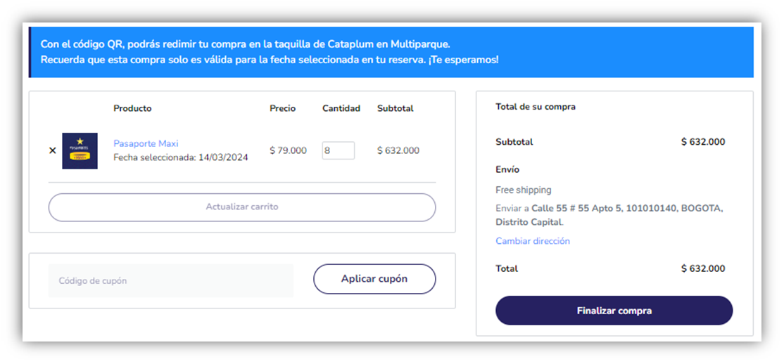 5: Revisa la cantidad de pasaportes que has seleccionado y procede al pago haciendo clic en “FINALIZAR COMPRA”.